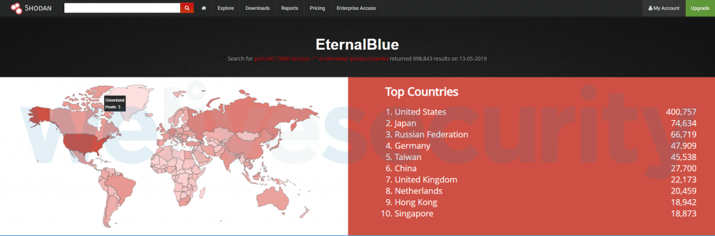 De acuerdo a datos extraídos de Shodan, actualmente existe cerca de un millón de máquinas operando de manera activa que utilizan el obsoleto protocolo SMB v1, exponiendo el puerto a Internet de manera pública. La mayoría de estos dispositivos están en los Estados Unidos, Japón y Rusia.