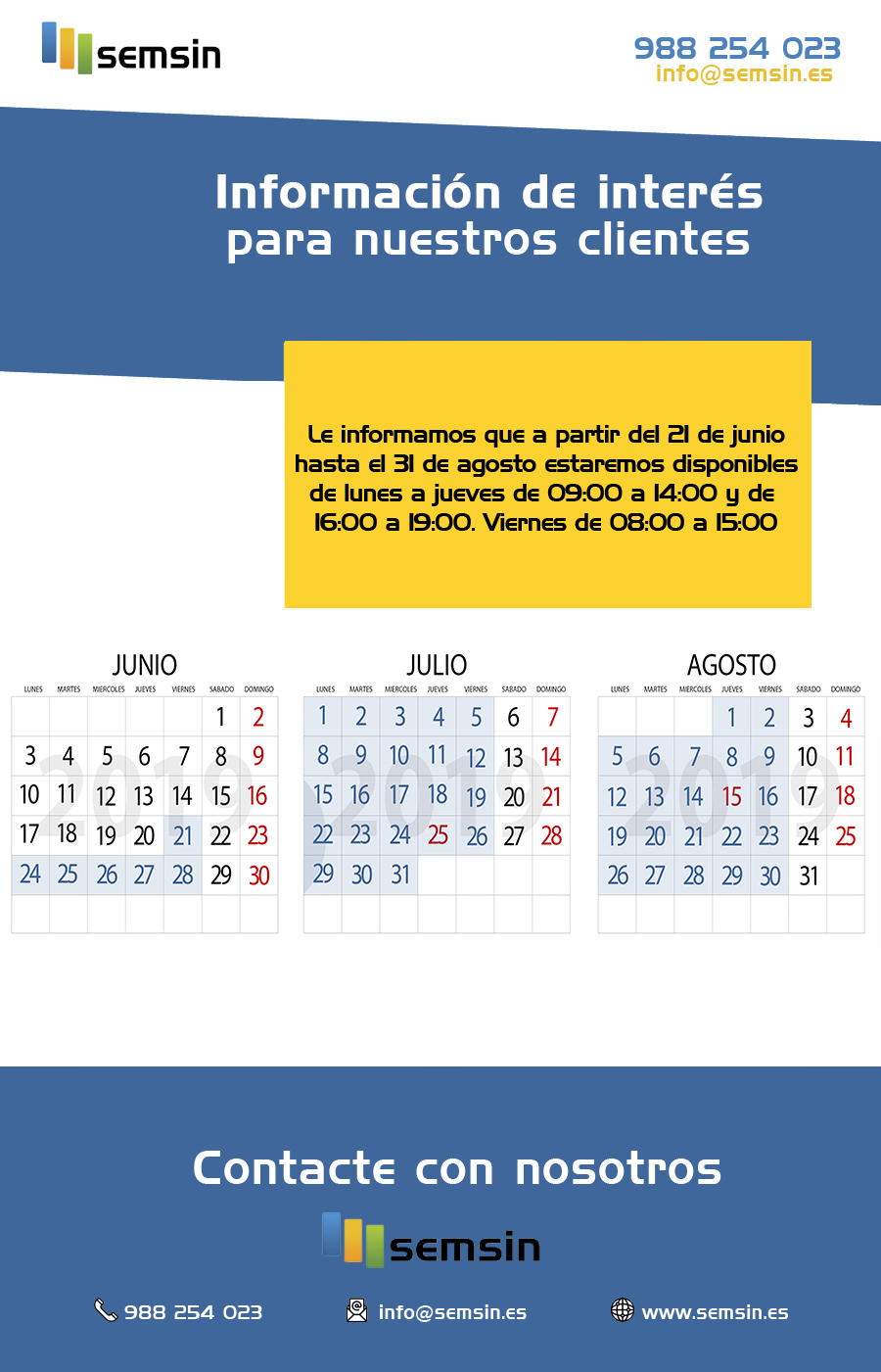 Le informamos que a partir del 21 de junio hasta el 31 de agosto estaremos disponibles de 09:00 a 14:00 y de 16:00 a 19:00. Viernes de 08:00 a 15:00.