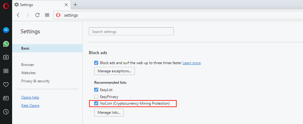 NoCoin es parte del bloqueador de anuncios nativos de Opera. El bloqueador de anuncios viene deshabilitado de forma predeterminada, y al habilitar el bloqueador de anuncios también se activa la protección contra minería de criptomonedas.
